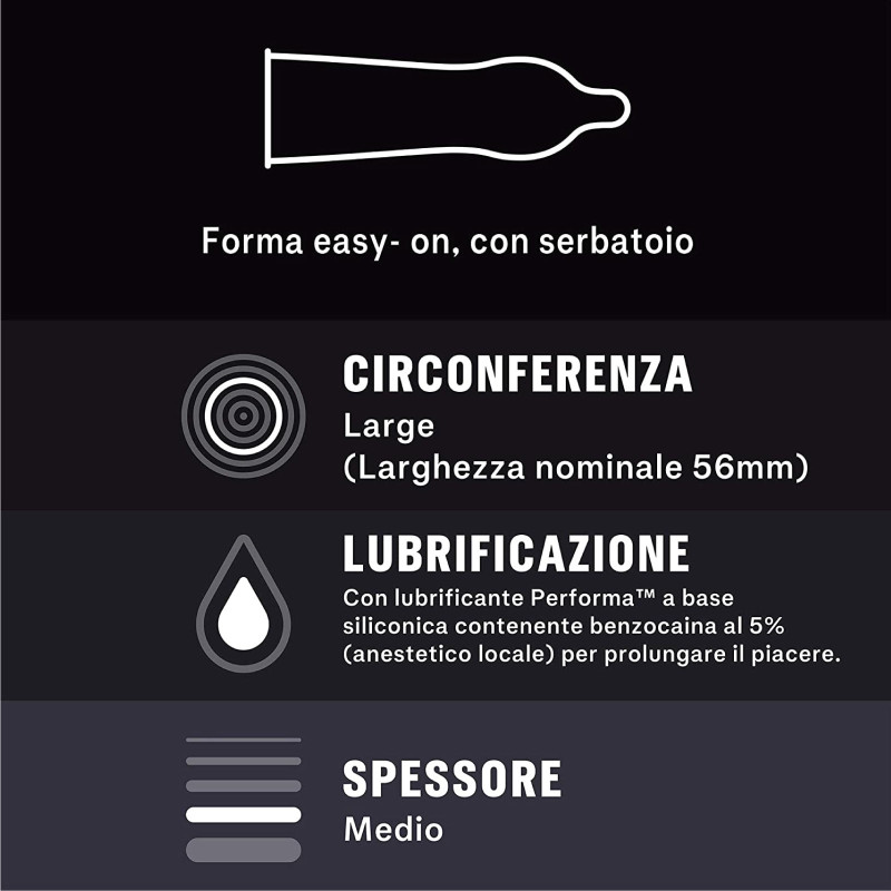 Preservativi in lattice di gomma naturale, con lubrificazione ritardante a base di benzocaina. Facili e veloci da indossare grazie all'innovativa forma easy-on. Larghezza nominale 56mm. Confezione da 12 profilattici.