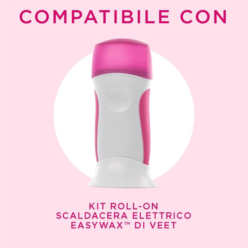 Ricarica di cera per pelli sensibili, compatibile con il kit roll-on scaldacera elettrico EasyWax Veet. Con formula Easy-Gelwax che garantisce una pelle liscia e morbida fino a 28 giorni. Ricarica Roll-on da 50ml + 12 strisce in TNT + 4 salviette post-epilazione.